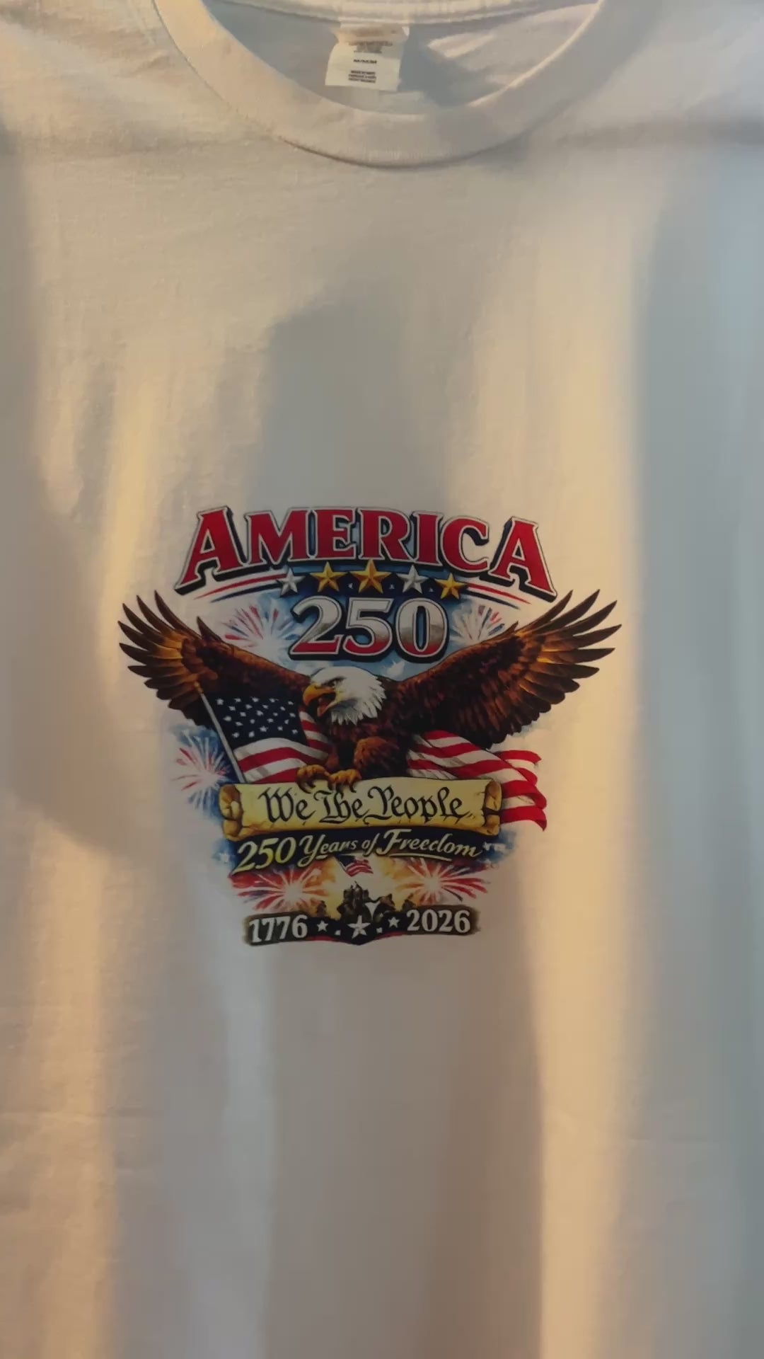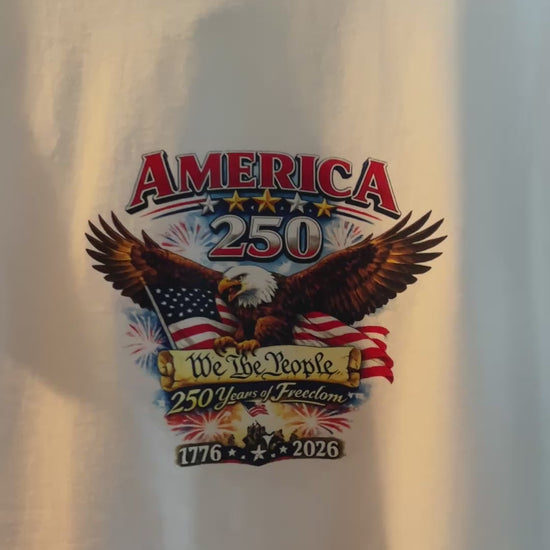 The back of the shirt takes it to the next level with a powerful image of the American bald eagle—a symbol of strength and freedom—surrounded by American flags. The design also features “America 250,” “We The People,” and “1776–2026: 250 Years of Freedom,” creating a stunning tribute to this historic milestone.